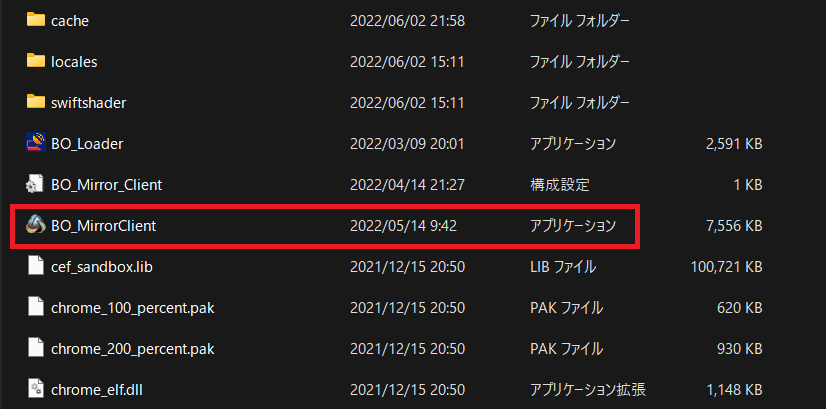 フォルダをお探しいただき、「BO_MirrorClient(アプリケーション)」を