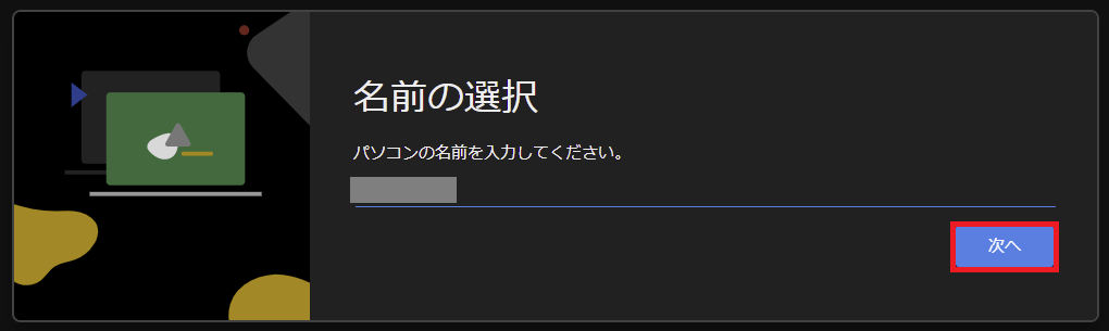 インストールが完了しますとパソコンの名前を確認されますので、間違いなければ「次へ」を